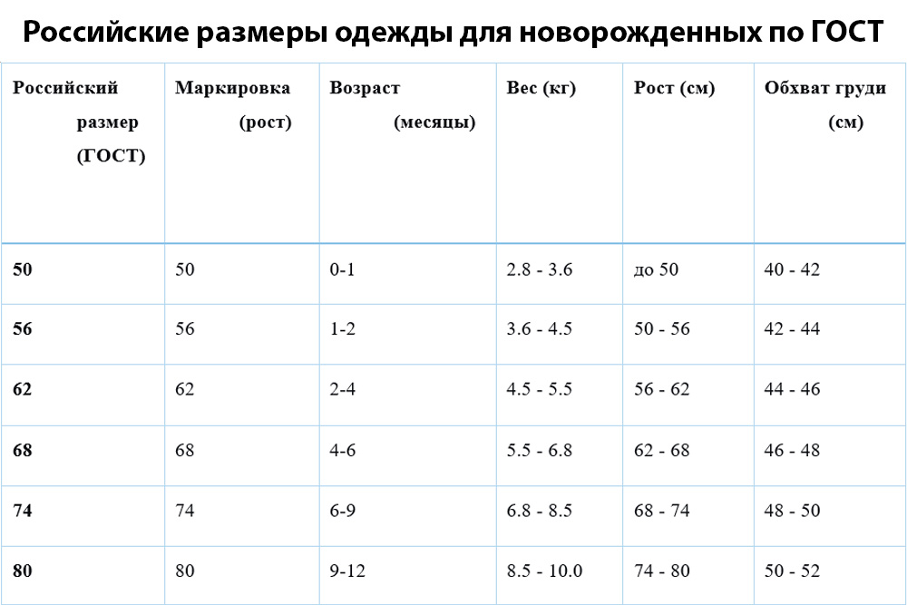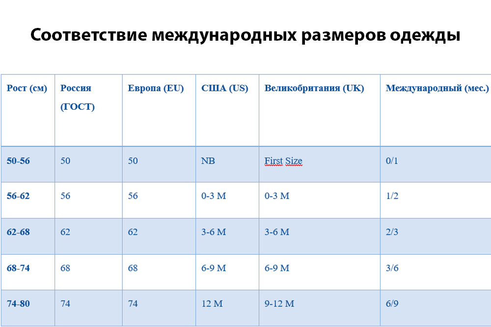 Основным параметром для выбора первого размера одежды является рост. Именно на него ориентируется большинство производителей. Используйте эту таблицу как отправную точку.