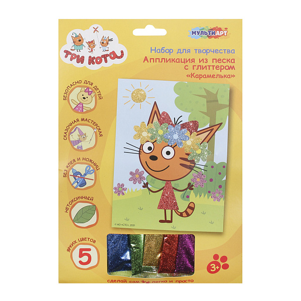 Набор для творчества «Аппликация из песка и глиттера Три Кота» — это увлекательный и красочный процесс создания яркой картины с изображением Карамельки из мультфильма «Три Кота». В комплект входит плотная картонная основа с готовым контурным рисунком, цветной и блестящий песок-глиттер.