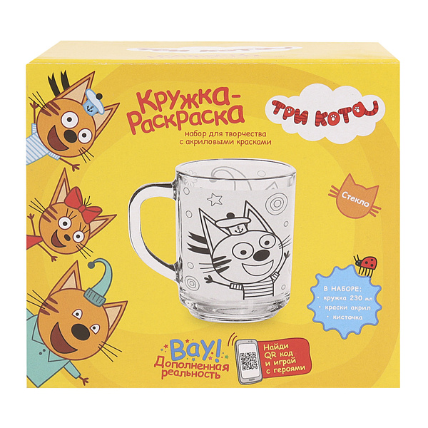Кружка для росписи «Три Кота» объемом 230 мл представляет собой стеклянную посуду, предназначенную для творчества. На прозрачных стенках кружки изображены любимые герои мультсериала «Три Кота», которые могут быть раскрашены по желанию юного творца.