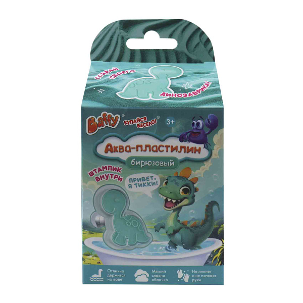 Бирюзовый аква-пластилин Baffy «Диномир» — это мягкая, веселая пластичная масса, которая превращает обычное купание в настоящий творческий остров приключений. В комплекте — забавный штампик в форме динозавра, с которым можно лепить фигурки прямо в воде и наблюдать, как они плавают, не разваливаясь и не липнув к рукам.