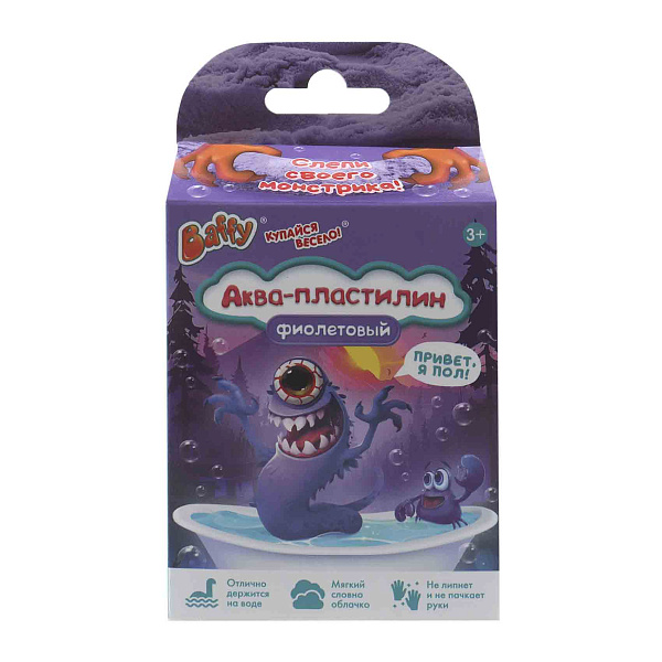 Аква-пластилин Baffy «Монстровселенная» фиолетовый— это мягкая, веселая масса, которая превращает простое купание в море творческих приключений. В комплекте — забавный глаз-игрушка, с помощью которого можно создать своего уникального водяного монстра прямо в воде и наблюдать, как он плавает, не разваливаясь и не липнув к рукам.