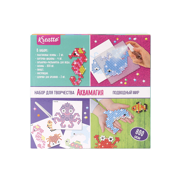 Оригинальная аквамозаика будет интересна детям дошкольного и младшего школьного возраста. В набор входят 2 основы из пластика, 4 шаблона, 800 бусин разного цвета, бутылка с распылителем, пара цепочек для брелоков, пинцет и инструкция.
