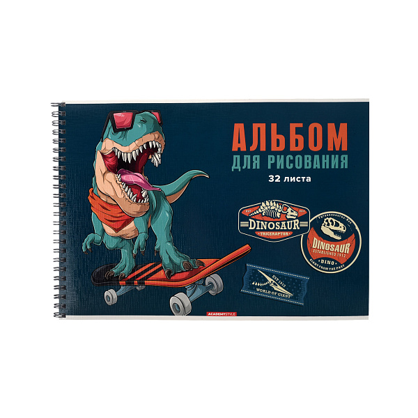 Со вкусом оформленный альбом для рисования понравится школьникам независимо от возраста и пола. Преимущественно такое оформление привлекает любителей доисторических ящеров. На лицевой стороне обложки на темном фоне изображен могучий тираннозавр, катающийся на скейтборде.