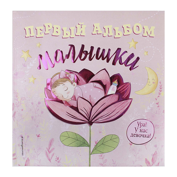 Книга воспоминаний «Первый альбом малышки» поможет сохранить волшебные моменты первых лет жизни ребенка. Обложка выполнена в нежных розовых тонах с изображением младенца, уютно устроившегося в цветке. Звездочки и улыбчивый месяц создают атмосферу сказочной нежности.