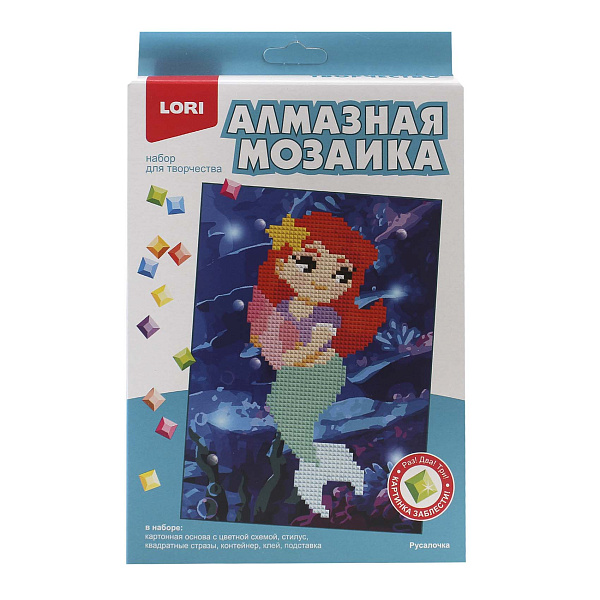 Набор для творчества «Алмазная мозаика» — это увлекательное занятие по созданию яркой и переливающейся картины с помощью множества маленьких разноцветных страз в форме квадратов. В комплект входят картонная основа с цветной схемой, набор разноцветных страз, удобный стилус для крепления страз, лоток, клей и подставка для комфортной работы.