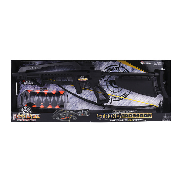 В комплекте идет 10 стрел с присосками, которые можно хранить в специальном держателе, расположенном на прикладе арбалета. На коробке изображена цветная мишень, которую можно вырезать и использовать для игры.