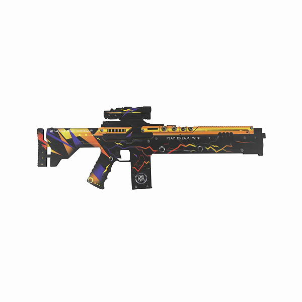 Юный боец с радостью примет в свой игровой арсенал оригинальный автомат, украшенный разноцветными молниями. Внушительное оружие станет основанием для продолжительных игр, займет внимание ребенка на долгое время.
