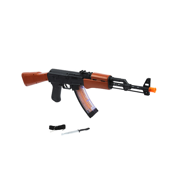 Автомат удивит ребенка реалистичным дизайном, вибрацией, световыми и звуковыми эффектами. В комплект входит штык-нож, обойма с патронами, ремешок, аккумуляторная батарея. Игрушка позволит придумать немало сложных ролевых сюжетов, станет источником положительных эмоций.