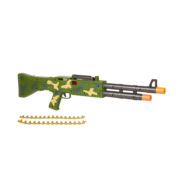 Защитная расцветка и два черных дула дают понять, что перед вами военный автомат – мощное оружие в руках защитника добра и справедливости. У пластикового автомата удобный приклад и ребристый подствольник, чтобы игрушку было комфортно держать в руках. Сверху есть черная ручка, за которую автомат легко носить между играми или на привалах. При нажатии на курок автомат издает громкие звуки стрельбы и мерцает. В комплект входят две ленты с патронами.