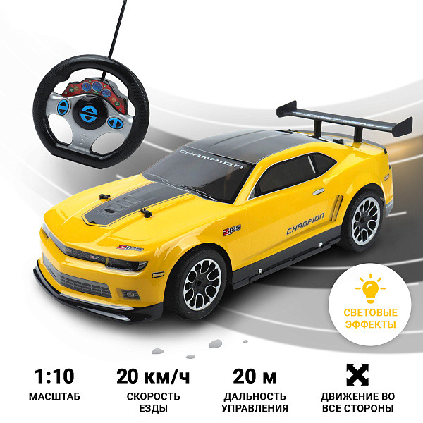 Ни одна захватывающая гонка не обходится без скоростного автомобиля. Гоночный 4-канальный желтый автомобиль CHEVROLET CAMARO изготовлен в масштабе 1:10 и работает за счет аккумулятора (идет в комплекте). Для скоростной езды достаточно зарядить батарею, и можно начинать гонку! Машинка двигается вперед и назад, а также вправо и влево, поэтому сможет совершать маневры и обгонять соперников. Световые 3D эффекты добавляют реализма в игру. Управляется игрушка с помощью пульта.