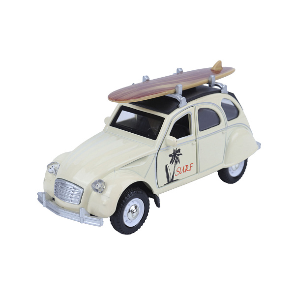 Модель раскрашена в приятный цвет, здорово сочетающийся с песчаными морскими пляжами. На передних дверцах, которые открываются с приятным сопротивлением, нанесен тропический принт. Крепления для багажа на крыше точно подогнаны под маленькую пластиковую доску для серфинга. Машина оснащена инерционным механизмом, а также способна издавать звуки и светить фарами, если вставить в нее батарейки. Рекомендовано для детей старше 3 лет.