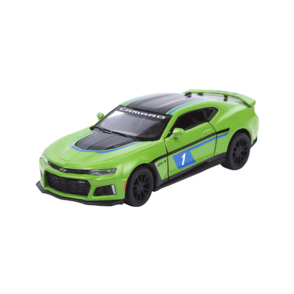 Уменьшенная модель настоящего автомобиля марки CAMARO ZL1. Все детали из металла, присутствуют пластмассовые элементы. Модель машинки ярко-зеленого цвета, с черной крышей и небольшим черным возвышением на капоте, которое отделяется синей полоской. На черной вставке над стеклом находится белая надпись «CAMARO». Фары автомобиля прозрачные спереди и красные сзади. На передней двери находятся две вставки черного и синего цвета с белым номером 1. Двери автомобиля открываются. Машинку можно катать и устраивать гонки. Ребенок почувствует себя настоящим гонщиком, если будет играть с ней. Рекомендовано для детей с 3 лет.