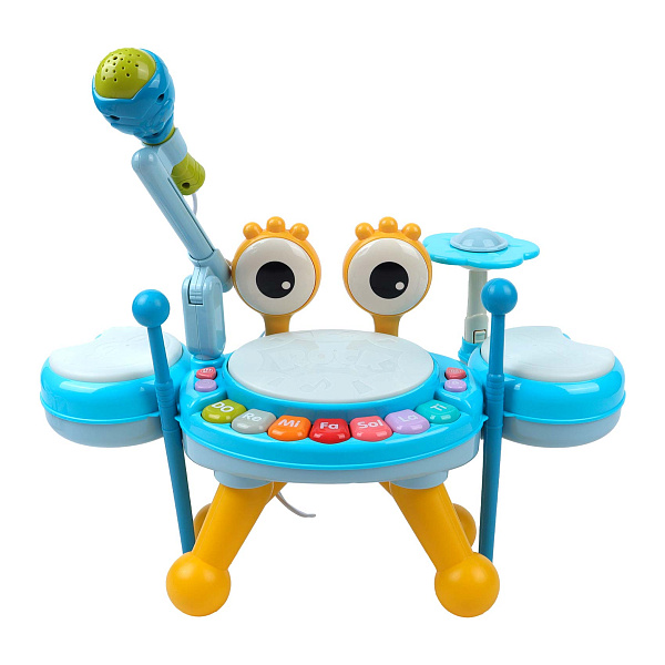 Детская барабанная установка выполнена в форме краба. Корпус игрушки сделан из пластика. В набор входит большой барабан с клавишами пианино. Клавиши подписаны названиями нот. Также в комплекте есть два маленьких ручных барабана.