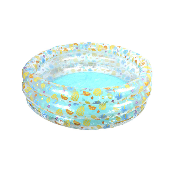 Бассейн изготовлено из прочного ПВХ (поливинилхлорида), в ярких летних цветах, а прозрачные стенки украшает разноцветный тропический орнамент. Его диаметр полтора метра. Внутри могут одновременно играть несколько малышей.