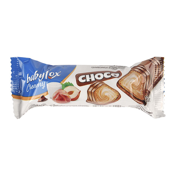 Вафельный батончик Babyfox Creamy Choco — вкусное лакомство для детей. Внутри — нежная начинка со сливочно-фундучным вкусом, которая прекрасно сочетается с хрустящей вафельной оболочкой.