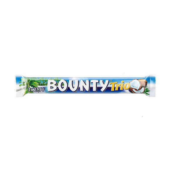 Самых ярых поклонников кокосовой начинки и молочного шоколада порадует батончик Bounty Trio. Внутри упаковки не две, а целых три мини-батончика. Почувствуйте удивительный гармоничный вкус нежной кокосовой стружки и нежного молочного шоколада. Состав батончика натуральный, здесь нет ароматизаторов, консервантов и красителей. Высокое содержание сахара позволяет быстро восполнить запасы энергии в течение дня. Батончик можно хранить в холодильнике, тогда шоколад станет хрустящим.