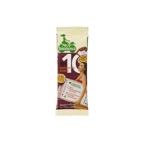 Батончик со вкусом маракуйи и кокоса изготовлен из кокосовой стружки, семян чиа и орехов кешью, которые обеспечивают высокое содержание протеина в готовом продукте. Входящие в состав батончика изюм, финики, маракуйя обогащают лакомство витаминами С, А, Е, улучшающими иммунный ответ в сезон подъема заболеваемости.