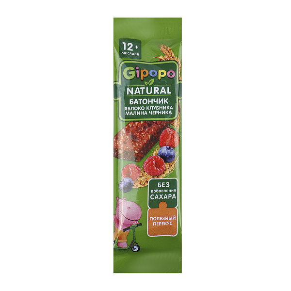 Батончик «Gipopo» злаково-фруктовый с яблоком, клубникой, малиной и черникой весом 20 г — это сочетание натуральных ингредиентов, обеспечивающее наслаждение вкусом и пользу для здоровья.