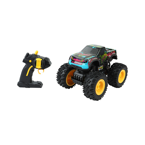 Юные автолюбители оценят его кузов типа пикап с двухместной кабиной. Колеса машинки – увеличенные с крупными протекторами, позволяющими преодолевать бездорожье.