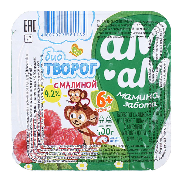 Биотворог «Ам-Ам» со вкусом малины — это полезный и вкусный продукт для малышей от 6 месяцев. Небольшую упаковку объемом 100 граммов удобно брать с собой в поездки или на прогулки.