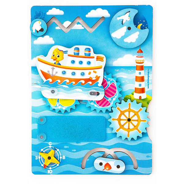 Занимательное и полезное приспособление развлечет мальчиков и девочек старше 1 года. Оно представляет собой основу из прочной фанеры, на которой зафиксированы подвижные детали. Их увлекательно вращать и перемещать по заданной траектории. Такие манипуляции активируют моторные функции, положительно влияют на воображение, логическое и пространственное мышление, речь и память. Части игрушки изготовлены из натуральной древесины, покрыты краской на водной основе, безопасной для организма ребенка.
