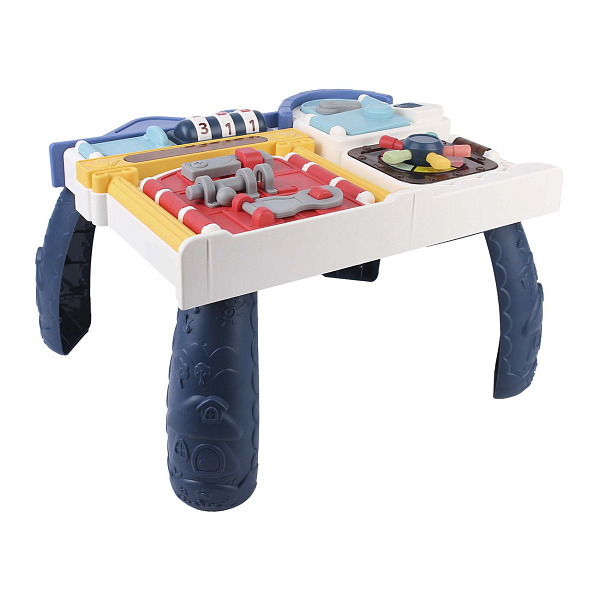 На поверхности столика расположены различные игровые панели с кнопками, крутилками и рычажками. Каждый элемент вызывает интерес, поддерживает обучение через игру и развивает координацию движений. Мелодии и световые эффекты добавляют дополнительную интерактивность и помогают малышу изучать звук и свет.