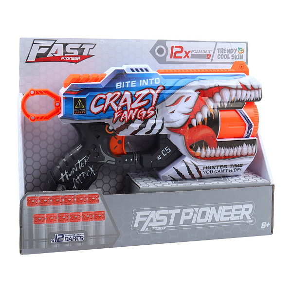 Игрушечный бластер серии fast выполнен в ярком дизайне с тематикой «crazy fangs», украшенном изображением пасти с острыми зубами. Изделие предназначено для стрельбы 12 мягкими пулями из пеноматериала. Бластер удобно размещается в руке, имеет эргономичную рукоятку и рассчитан на детей от 8 лет и старше.
