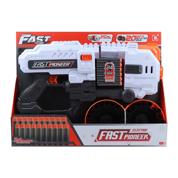 Бластер FAST с мягкими пулями и барабаном — спортивная и яркая игрушка, выполненная в сочетании белого, черного и оранжевого цветов, что придает модели современный и динамичный вид. Особенностью бластера являются два вращающихся барабана, каждый из которых вмещает мягкие пули и обеспечивает быструю и непрерывную стрельбу. Эргономичная рукоятка с рифленой поверхностью обеспечивает удобный хват и маневренность во время игры.