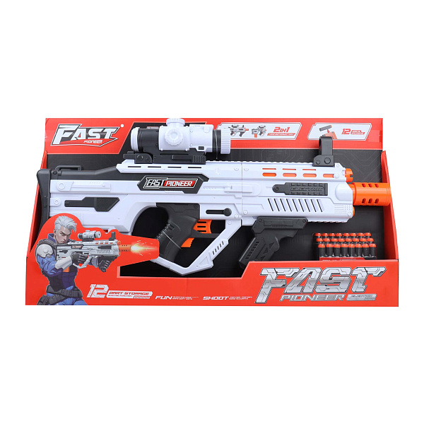 Автомат FAST с мягкими пулями — современная игрушка с футуристическим дизайном в бело-черных тонах с ярко-оранжевыми элементами. Модель оснащена съемным прицелом и удобной рукояткой, а также магазином, рассчитанным на 12 мягких пуль. Особенностью автомата является функция трансформации «2 в 1», позволяющая изменять конфигурацию оружия для разнообразия игровых сценариев.