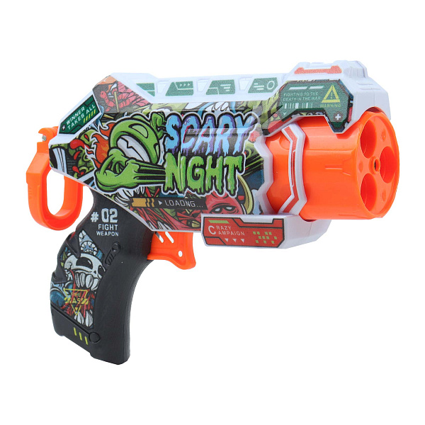 Бластер FAST SCARY NIGHT — компактное и яркое игровое оружие с эффектным граффити-дизайном в стиле «страшной ночи». Корпус выполнен в сочетании белого, оранжевого и чёрного цветов с выразительными надписями и рисунками, придающими изделию агрессивный и динамичный внешний вид. Эргономичная рукоятка и вращающийся барабан делают бластер удобным и интересным в использовании.