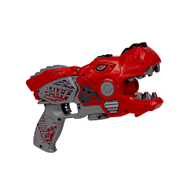 Внешний вид бластера выполнен в виде динозавра: ярко-красная морда тиранозавра, из устрашающе открытой пасти которого вырывается не рык, а патроны – это ли не повод врагам сдаться и признать поражение?