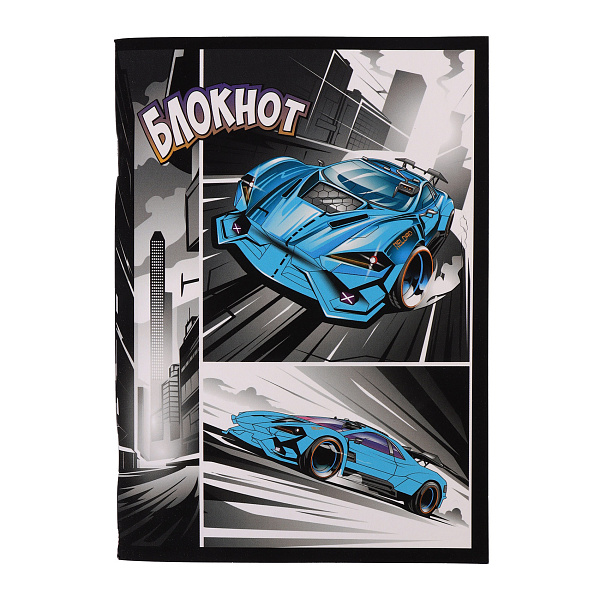 Блокнот «Гонка» — это идеальный аксессуар для юных автолюбителей и поклонников скорости. Обложка блокнота украшена динамичными изображениями гоночных автомобилей на фоне городских пейзажей, выполненными в ярких синих и серых тонах.