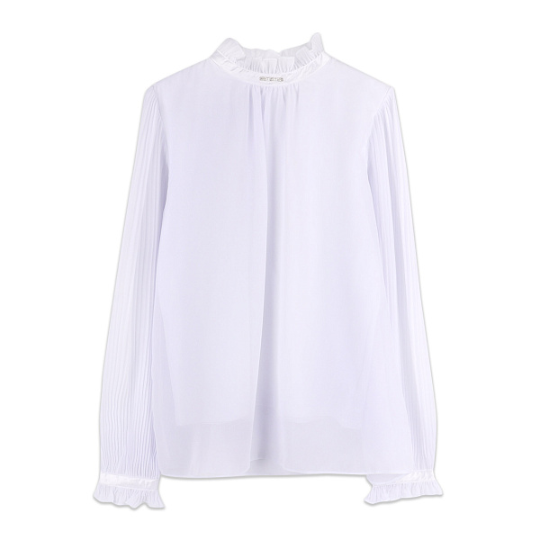 Модель выполнена из качественного комбинированного полотна белого цвета свободного кроя. Воротник блузки украшен атласной лентой и небольшими бусинами, что придает изделию элегантный и торжественный вид. Длинные рукава с плиссированным оформлением добавляют образу изысканности.