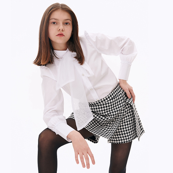 Белая блуза – необходимая вещь в гардеробе любой школьницы. Блуза выполнена в оригинальном дизайне, сочетая классику и игривость. Свободный фасон подходит для любого типа детской фигуры. В такой блузе будет комфортно сидеть на уроках или выступать на мероприятиях.