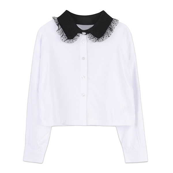 Белая блузка для девочки изготовлена из качественных материалов: 55% вискозы, 40% нейлона и 5% эластана, а отделка — полиэстер 100%. Модель отличается элегантным дизайном с отделкой черным воротником с рюшей и мелким горошком, что придает изделию нарядный и стильный вид. Классический крой с длинными рукавами и застежками на пуговицах обеспечивает удобство в ношении и легкость раздевания и одевания.
