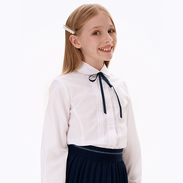 Блузка для девочки — стильный и практичный элемент школьного гардероба. Белый цвет делает блузку универсальной и подходящей как для ежедневного ношения, так и для школьных праздников. Закругленный воротничок с синим бантом создают элегантный вид. Центральная часть украшена вертикальными складками. Благодаря длинному рукаву блузка подойдет для холодного сезона.