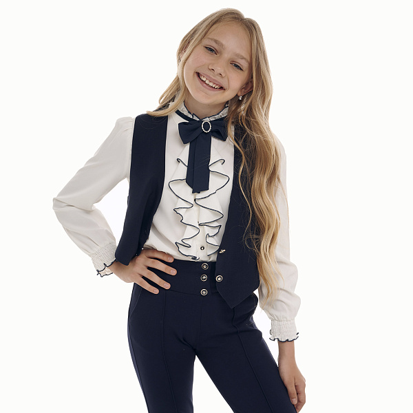 Легкая блуза белого цвета – идеальное решение для школьного гардероба ребенка. Изделие пошито из приятного на ощупь полиэстера, который хорошо пропускает воздух, поэтому обеспечивает комфорт для юной школьницы на протяжении всего учебного дня. Блузка имеет длинные объемные рукава на резинке с красивым фигурным низом, отложной воротник с большим контрастным бантом черного цвета и рюшами. Пуговицы черные, крой блузки прямой. Цвет изделия: белый.