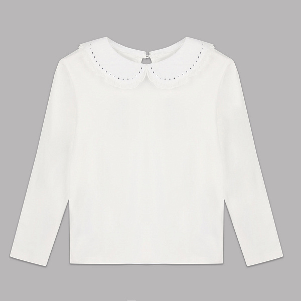 Блузка с длинным рукавом для девочек выполнена из мягкого трикотажа. Белый цвет усиливает классический стиль и легко сочетается с любыми элементами школьного гардероба.