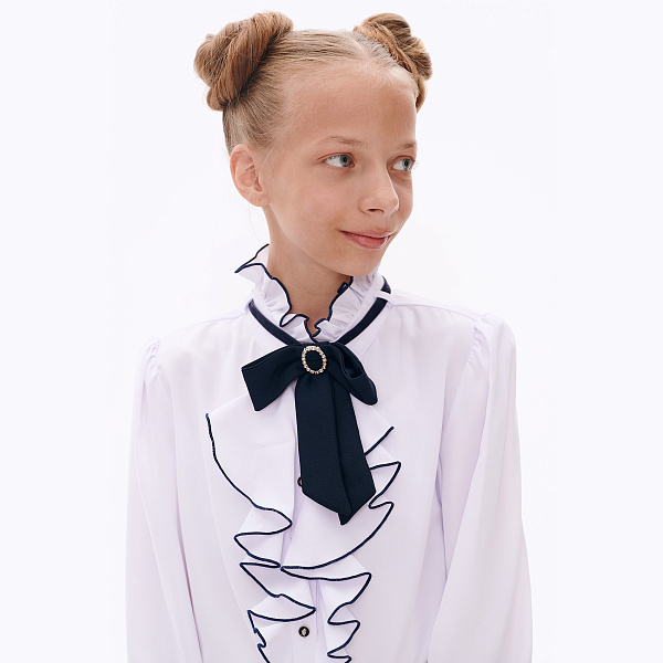 Школьная блузка белого цвета — стильное и элегантное изделие для маленьких модниц. Эта блузка имеет оригинальный дизайн: воротник в стиле жабо и аккуратный бантик, а декоративная окантовка в синем цвете добавляет яркий акцент. Эта блузка отлично сочетается с юбками, брюками и сарафанами, что позволяет создавать разнообразные образы для каждого дня в школе. Белый цвет делает её универсальной и подходящей к любому стилю.