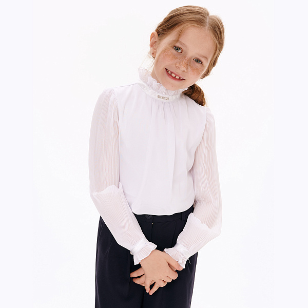 Нарядная блузка для девочки — это стильный элемент школьного гардероба, который внесет в нотку праздника в учебные будни. Белая блузка отлично сочетается с школьной формой разных цветов. Воротник-стойка, атласная вставка и небольшое украшение с жемчужинами придает изделию элегантный вид. Длинные рукава и воротник сшиты из легкой плиссированной ткани.