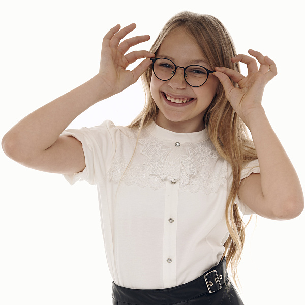 Уникальное кружевное украшение придает блузке изысканный и нежный вид. Эта оригинальная деталь добавляет стиля, подчеркивая индивидуальность маленькой модницы.