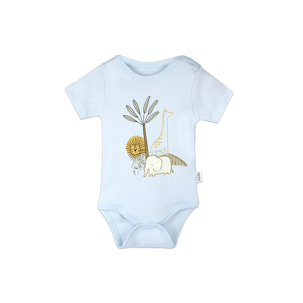 Боди с коротким рукавом для мальчика сшито из мягкой и приятной на ощупь хлопковой ткани. Боди светлого голубого оттенка спереди украшает рисунок в виде пальмы и забавных зверей. Преимуществом такой одежды является то, что благодаря своей конструкции и надежным застежкам-кнопкам, она не закатывается и не снимается во время движений младенца. Боди удобно и просто надевать и снимать, что особенно важно для мамы при переодевании ребенка. Эту модель можно носить как одежду летом или как нижнее белье зимой, добавляя к нему другие предметы одежды. Края коротких рукавов обработаны фабричным швом. Низ изделия и круглая горловина обработаны мягкой трикотажной резинкой.