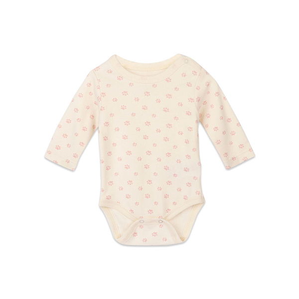 Боди для девочки изготовлено из хлопковой ткани без примеси синтетики. Эта одежда нежно облегает фигуру малыша, не раздражает кожу, хорошо пропускает воздух, является теплой и комфортной. Цвет изделия - молочный с принтом по всей поверхности.