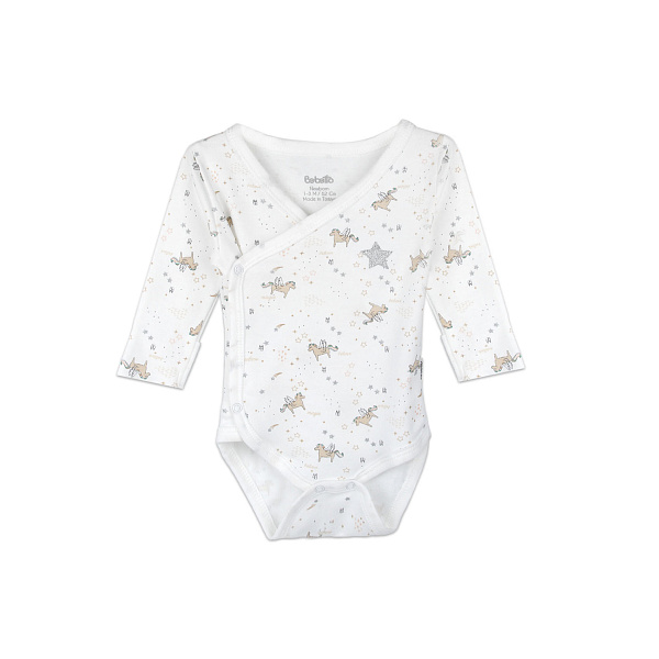 Боди с длинным рукавом для девочки сшито из 100% хлопковой ткани с мягкой текстурой. Хлопковый трикотаж приятен к коже, также он обеспечивает естественную вентиляцию и впитывает излишки влаги. Белую ткань украшает рисунок в виде сказочных пегасов с крыльями и небесных звезд. Модель с удобной застежкой на кнопках распахивается полностью. Это поможет с легкостью одеть любого ребенка, даже самого активного непоседу. Края длинных рукавов обработаны фабричным швом. Горловина и низ отстрочены мягкой трикотажной резинкой, обеспечивающей комфортное прилегание.