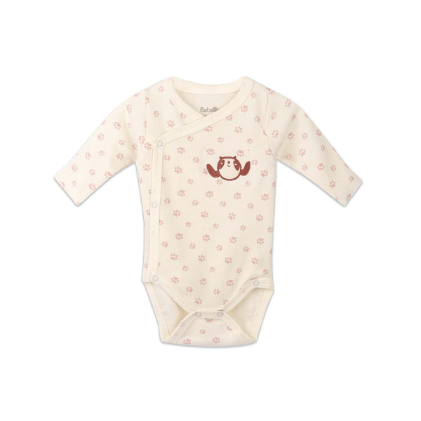 Удобное боди с длинным рукавом послужит удачным элементом гардероба маленькой девочки. Важным преимуществом модели является застежка в виде кнопок, идущая от горловины по всему боковому шву. Она позволяет переодеть малышку или заменить подгузник, затратив на процедуру минимум усилий. Для оформления выбраны нежные цвета и схематичные изображения отпечатков кошачьих лапок.