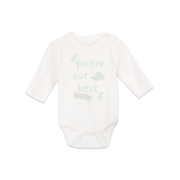 Детский боди белого цвета порадует и малыша, и его заботливых родителей. В основе ткани использован натуральный хлопок. Материал чудесно пропускает воздух, при этом сохраняя тепло. А структура нитевых волокон дарит боди мягкость и эластичность. Нижняя часть изделия обработана каймой в тон в основному цвету, также внизу имеются специальные кнопки-застежки, которые позволяют менять малышу подгузник. Рукава длинные, горловина круглая с дополнительными кнопками для комфортного переодевания. Завершает дизайн принт с надписью салатового цвета. Рекомендовано для детей ясельного возраста.