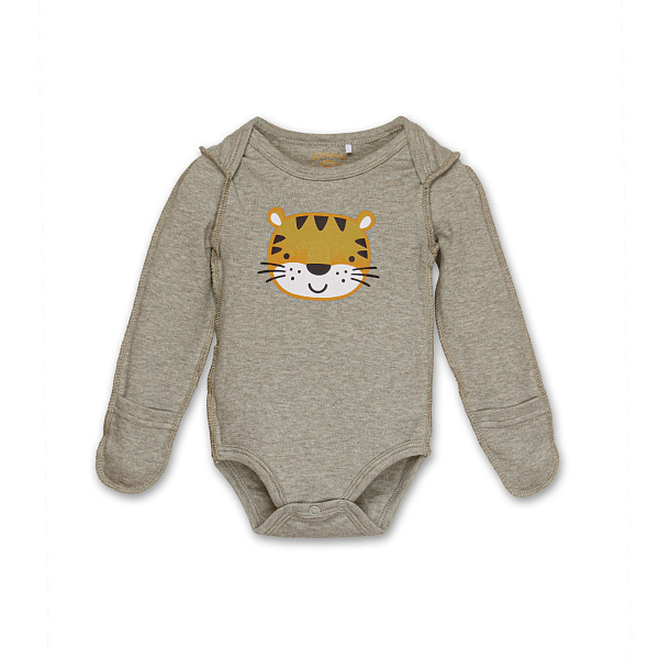 Детское боди из тонкого трикотажа темно-серого цвета с красочным рисунком мордочки тигра на груди. Внешние швы выполнены по наружной стороне, чтобы минимизировать дискомфорт для малыша и предотвратить возможное натирание чувствительной детской кожи. Изделие изготовлено из 100% хлопка. Горловина и срезы нижней части обработаны косой бейкой в цвет. Между ножек предусмотрена застежка на три кнопки, которая обеспечивает возможность быстрой смены подгузника. Для комфортной процедуры одевания малыша соединение переда и спинки выполнено внахлест. Рукава изделия оканчиваются антицарапками (для размеров 56-62).