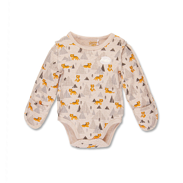 Трикотажное боди для малышей в белом цвете с ярким принтом для малышей ростом 80 сантиметров. Длинные рукава заканчиваются варежками-антицарапками. Швы выполнены по наружной стороне, чтобы предотвратить возможные натирания и дискомфорт для малыша. Горловина и края полочек оформлены широкой белой косой бейкой с фактурой в рубчик. Застежка в плечевом шве позволяет легко надевать боди через голову. Застежка между ног предусмотрена для быстрой и комфортной замены подгузника при необходимости. Все застежки выполнены с использованием маленьких кнопок.
