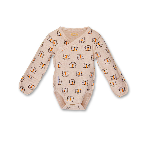 Боди для малышей из трикотажного полотна с антицарапками на рукавах (для размеров 56-62) в приятной расцветке и принтами в виде мордочек забавных тигров. Кремового цвета само изделие изготовлено из 100% хлопка без добавления синтетики. Для исключения контакта нежной кожи малыша с элементами швов, все соединения полотен выполняются только по лицевой стороне изделия при помощи оверлока. Горловина, открытые срезы полочек и нижняя часть изделия оторочены косой бейкой из основного полотна. Модель боди выполнена с использованием застежки на запах. Кнопки расположены и в зоне между ног, чтобы быстро заменить подгузник при необходимости.