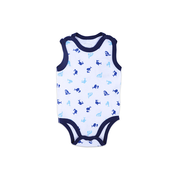 Для прогулок в жаркую погоду в качестве нижнего слоя или домашней одежды настоящей находкой станет боди без рукава. Модель привлекает внимание узором в виде занятных рыбок. Заметно упрощают процесс переодевания застежки в виде кнопок на плечике и между ножек. С их помощью можно заменить подгузник быстро и аккуратно. Изделие сшито из мягкого трикотажа, в составе которого использован 100% хлопок. Материал чудесно пропускает воздух, не деформируется, стойко переносит стирку в ручном и машинном режиме. Наружные швы и ровная окантовка не вызовут дискомфортных ощущений, не натирают кожу малыша.